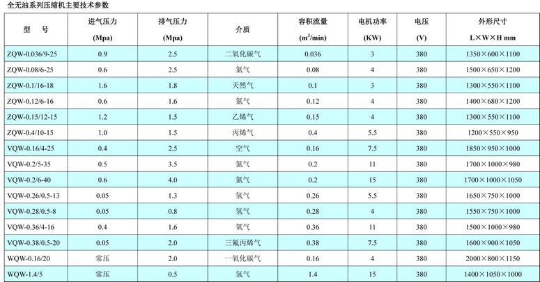 全無油系列壓縮機(jī)為往復(fù)活塞式。該系列壓縮機(jī)為公司自行研制生產(chǎn)的產(chǎn)品。該系列產(chǎn)品具有結(jié)構(gòu)緊湊、振動(dòng)小、噪音低、運(yùn)行平穩(wěn)、使用方便、安全可靠等特點(diǎn)。由于該系列產(chǎn)品為全無油潤(rùn)滑,從而保證壓縮機(jī)輸送出去的氣體不含油。全無油系列壓縮機(jī)已使用于氮?dú)?、氫氣、天然氣、三氟丙烯氣等氣體的增壓和輸送。